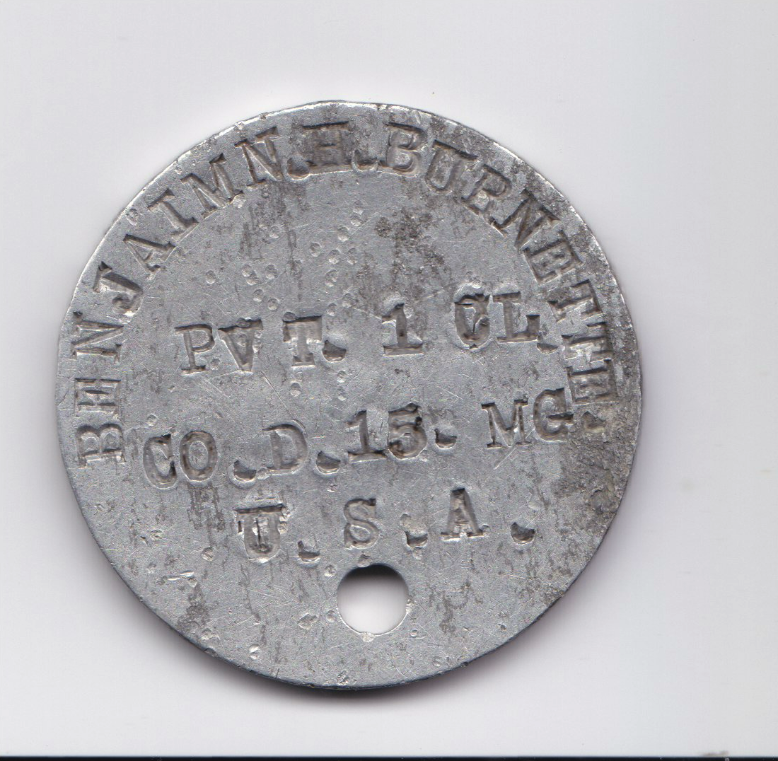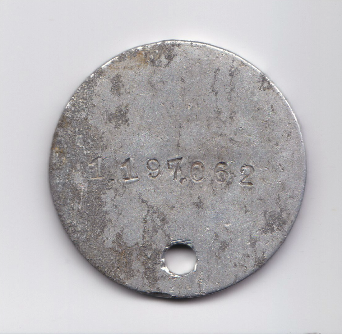 Il s'agit de l'identification, également appelée "Dog Tag", d'un soldat américain enrolé lors de la guerre de 14-18. Comme on peut le voir, il s'agit de Benjamin Burnette, simple soldat (Private), du 15e bataillon (15th Machine Gun) et dont le numéro est le 1.197.062. Il a probalement séjourné au Haut du Port durant l'été 1918 ce qui semble confirmé par les mouvements de son bataillon (plus précisément du 17 juillet au 23 août 1918)
